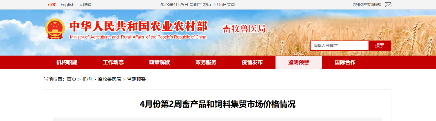 據(jù)對(duì)全國500個(gè)縣集貿(mào)市場和采集點(diǎn)的監(jiān)測,4月份第2周(采集日為4月12日),生豬產(chǎn)品、家禽產(chǎn)品、牛羊肉、飼料價(jià)格下跌,生鮮乳價(jià)格持平。生豬產(chǎn)品價(jià)格。全國仔豬平均價(jià)格36.89元/公斤,比前一周下跌1...
